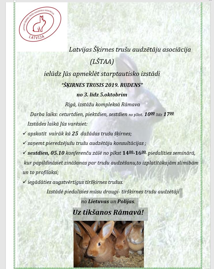 rīkotajai visas Eiropas izstādei Slovākijas pilsētā Nitrā šī gada novembrī, kurā piedalīsies LŠTAA biedri ar saviem lolojumiem, kuru atlase tiek rūpīgi veikta jau tagad, jo piedalīties var tikai pieaugušu, no 8 mēnešiem, trušu kolekcijas.